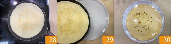 Continúa la cocción durante otros 20 segundos también del otro lado 28. A medida que estén listas, apílalas en un plato 29 y continúa la cocción de esta manera hasta terminar la masa 30.