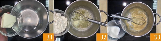 Prepara la Bechamel: coloca la mantequilla en una olla 31 y déjala derretir, luego añade la harina de una vez 32 y mezcla rápidamente con un batidor hasta obtener un roux dorado. Agrega la leche caliente 33 y mezcla enérgicamente.