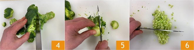 Pasa a los brócolis: saca las florecillas 4, luego pela el tallo 5 y pícalo finamente 6.