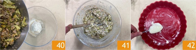 Añade la mezcla de brócoli y salchicha ya tibia 40, luego mezcla bien 41. Toma una bandeja de horno y unta un poco de mantequilla, luego extiende en el fondo un par de cucharadas de bechamel 42.