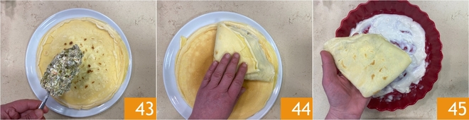 Rellena las crepes con el relleno 43 colocándolo en un cuarto de la superficie, luego dóblalas formando triángulos 44. Coloca las crepes rellenas 45 en círculo, superponiéndolas ligeramente.