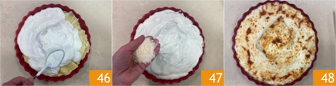 Cubre con la bechamel restante 46 y completa con abundante Parmigiano Reggiano rallado 47 y unos trocitos de mantequilla en la superficie. Cocina en horno ventilado precalentado a 170°C durante unos 20-30 minutos, hasta que la superficie esté bien dorada y gratinada. Saca del horno y deja reposar unos minutos antes de servir tus crepes rellenas de requesón, brócoli y salchicha 48!