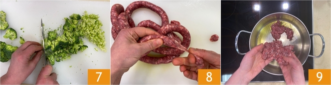 Recoge las florecillas, deja enteras las más pequeñas y corta en trozos las más grandes para que se cocinen de manera uniforme 7. Ahora saca la salchicha de la tripa 8. En una sartén grande calienta un buen chorro de aceite de oliva virgen extra, luego añade la salchicha desmenuzándola con las manos 9.