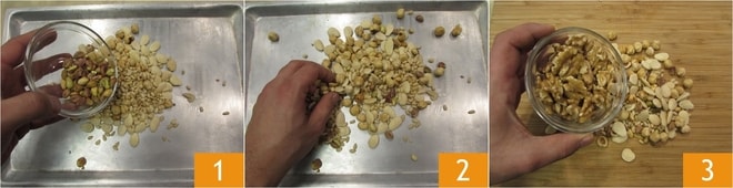 Para preparar el croccante, lo primero es tostar los frutos secos: colocad en una bandeja de horno los piñones, los pistachos, las almendras y las avellanas 1, distribuidlos en la bandeja 2 y tostádlos en el horno estático precalentado a 180° durante 5 minutos. Una vez tostados, colocad los frutos secos en una tabla y agregad también las nueces 3.
