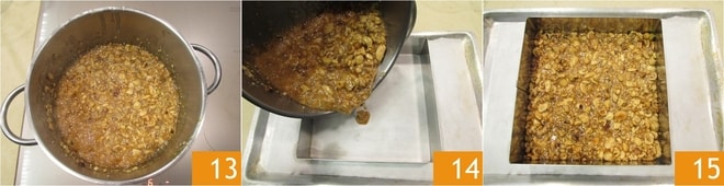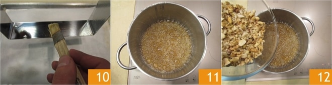 Aceitad el borde interior del molde 10. Mientras tanto, el jarabe se habrá vuelto de color ámbar y aparecerán burbujas en la superficie 11. En este punto, añadid los frutos secos 12.