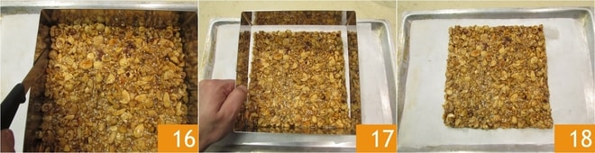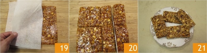Voltead el croccante sobre una tabla, quitad el papel de horno 19 y cortadlo en 8 trozos iguales 20. Dejad reposar hasta que las barritas se hayan compactado y endurecido completamente. Luego podéis trasladar el croccante a un plato para servir 21!