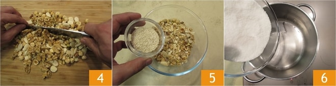 Triturar todo toscamente con un cuchillo 4. Verted la mezcla en un bol, añadid el sésamo 5 y mezclad. Ahora ocupáos del caramelo: en un cazo verted el agua y el azúcar 6.