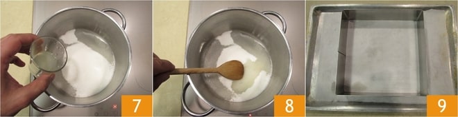 Añadid también el zumo de limón 7, mezclad con una cuchara 8 y dejad disolver hasta que el jarabe alcance una temperatura de 140°. Tomad un molde cuadrado sin fondo de 20x20 cm y colocadlo sobre una bandeja forrada con papel de horno 9.