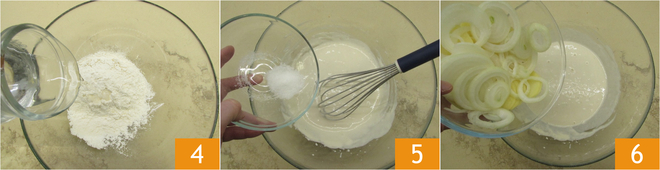 Vierte la harina y el agua en un bol 4 y mezcla con un batidor manual hasta obtener una mezcla lisa y homogénea, luego añade 2 cucharaditas rasas de sal 5 y la pimienta y mezcla de nuevo. Finalmente, añade las patatas y las cebollas 6.