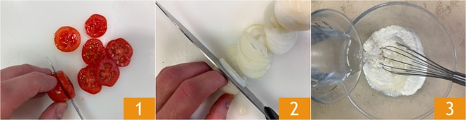 Para preparar la croccantella de verano con tomates, lo primero que hay que hacer es cortar en rodajas los tomates 1 y la cebolla 2 y reservar. Coloca la harina en un bol y vierte poco a poco el agua, mezclando con unas varillas para no formar grumos 3.