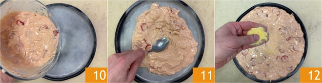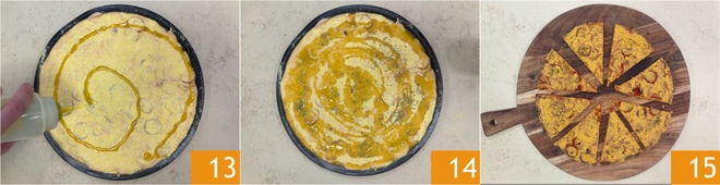 Vierte la mezcla en un molde antiadherente de 32 cm, engrasado con mantequilla y enharinado 10, y nivela bien 11. Espolvorea la superficie con harina de maíz 12.