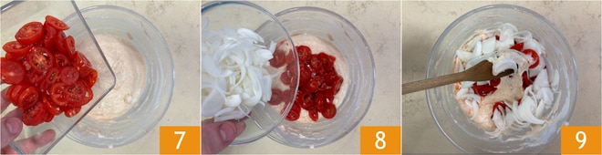Agrega también los tomates 7 y la cebolla 8, luego mezcla bien todo 9.