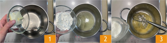 Para preparar el croque madame comienza con la bechamel casera: en un cazo derrite la mantequilla 1, añade la harina 2, cocina a fuego lento durante 2-3 minutos mezclando con la varilla. Ahora añade la leche poco a poco 3.