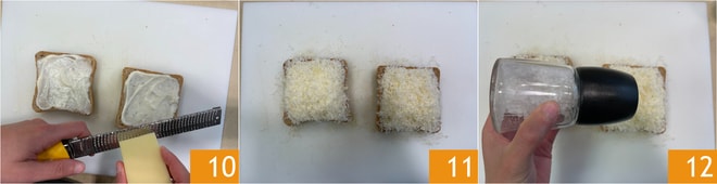 Ahora unta más bechamel en la superficie 16, ralla más queso 17 y transfiere los croque monsieur a una bandeja forrada con papel de horno 18. Hornea en un horno ventilado precalentado a 190° durante 12 minutos o hasta que estén dorados.