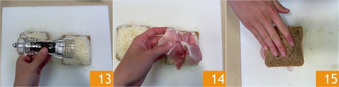 Pimienta 13 y rellena con las rebanadas de jamón 14. Cierra una rebanada encima de la otra, manteniendo el relleno en el interior, presiona ligeramente con la palma de la mano 15.