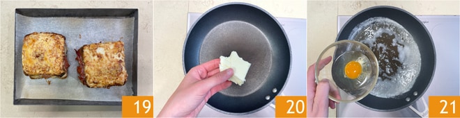 Mantén en caliente 19. Mientras tanto, prepara el huevo: derrite un trozo de mantequilla en la sartén 21, cuando haya adquirido un color avellana coloca el huevo entero en el centro 21.