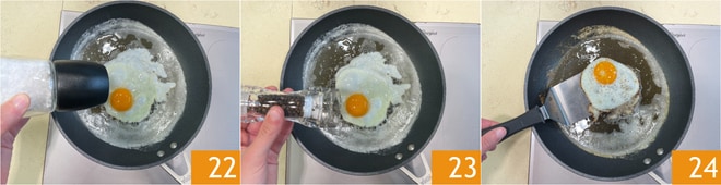 Sala 22 y pimienta 23, cocina durante unos 3 minutos, hasta que el fondo del huevo esté crujiente 24.