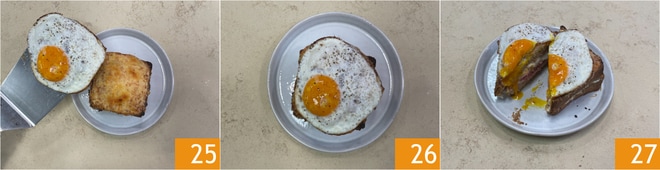 Completa el croque madame colocando el huevo encima 2526 y sírvelo inmediatamente en la mesa 27.