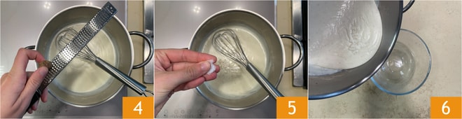 Hierve la salsa a fuego lento mezclando siempre con la varilla. Ralla la nuez moscada 4, sala y pimienta 5. Una vez espesada, transfiere la bechamel a un bol 6.