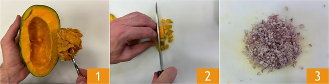 Para preparar las croquetas de arroz con calabaza y stracchino, primero quita las semillas y la cáscara de la calabaza 1, luego córtala en cubos de medio cm 2. Pela y pica el chalote 3.