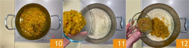 Cuando la calabaza esté blanda 10, añádela al arroz cocido y escurrido 11, luego añade también el chalote 12 y aromatiza con mejorana.
