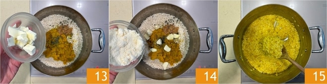 Manteca con mantequilla 13 y Parmigiano Reggiano DOP rallado 14. Mezcla para integrar todo 15.