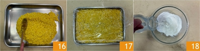 Extiende el arroz sobre una bandeja amplia 16 y deja enfriar, luego cubre con film transparente 17 y lleva al frigorífico para que se endurezca durante aproximadamente una hora. Ahora prepara la masa: en un bol, vierte la harina y el agua 18.