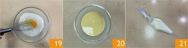Añade una pizca de sal y el huevo, luego mezcla con un batidor 19 para obtener una masa suave y sin grumos 20. Transfiere el stracchino a una manga pastelera 21.