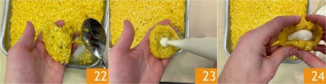 Saca el arroz del frigorífico, toma una cucharada 22, aplánala para formar un disco y exprime en el centro un montoncito de stracchino 23. Cierra el disco envolviendo el queso con el arroz 24.