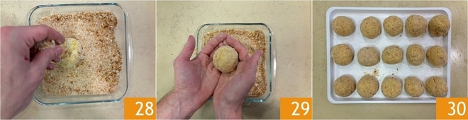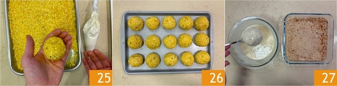 Dale una forma esférica 25 y colócala en una bandeja 26. Continúa de esta manera hasta terminar con los ingredientes. Ahora sumerge las croquetas en la masa 27.