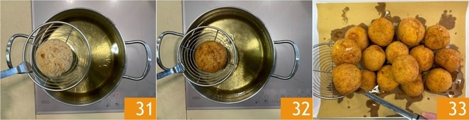 Fríe en aceite de semillas caliente a 180° 31, teniendo cuidado de sumergir pocos trozos a la vez para no bajar la temperatura del aceite. Cuando estén doradas, escúrrelas 32 sobre papel para fritos 33, sazona con sal y sirve calientes tus croquetas de arroz con calabaza y stracchino.