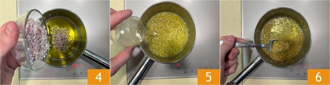 Calienta un poco de aceite de oliva en una cacerola, añade el chalote picado 4 y sofríelo en el aceite durante unos 10 minutos a fuego medio-bajo. En este punto, añade el vino blanco 5, deja que el alcohol se evapore y cocina a fuego bajo durante 5 minutos. Una vez listo, deja el sofrito a un lado 6.