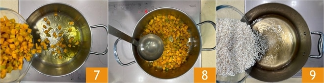 En otra cacerola, calienta otro poco de aceite, añade los cubos de calabaza 7 y sofríelos brevemente, luego sazona con sal y pimienta, y cocina durante 15 minutos añadiendo unos 200 g de caldo de verduras 8. Mientras tanto, hierve el arroz en 700 g de caldo de verduras durante 12 minutos 9.