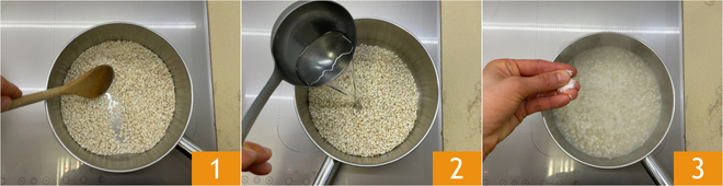 Para preparar las croquetas de arroz con provolone y jamón cocido, primero tuesta el arroz en seco en un cazo 1, agrega un cucharón de agua hirviendo 2, o caldo, y ajusta de sal 3.