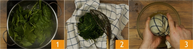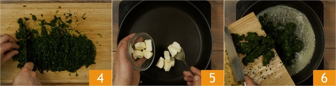 Pícalas con el cuchillo 4. Derrite en una sartén la mantequilla 5, añade las espinacas 6 y sofríelas durante unos 2 minutos sin que se vuelvan crujientes.
