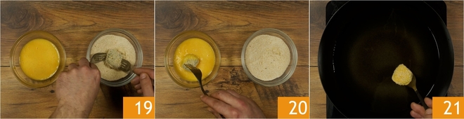 Luego por el pan rallado 19, y nuevamente huevo 20 y pan rallado, de esta forma obtendrás un empanado más crujiente. Una vez hechas todas, fríelas en aceite caliente a unos 170 °C 21.