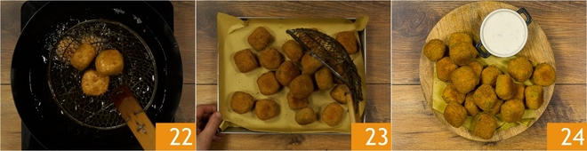 Cuando estén doradas, unos 2-3 minutos después, escúrrelas 22 en una bandeja cubierta con papel absorbente 23. Sirve las croquetas de espinacas con la salsa de gorgonzola 24