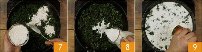 Añade la harina 7 y mezcla. Cuando esté completamente absorbida, añade la leche 8, condimenta con nuez moscada, sal y pimienta 9.