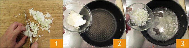 Para preparar las croquetas de jamón, pica finamente una cebolla 1. Derrite la mantequilla en cacerola 2 y sofríe la cebolla durante 10 minutos a fuego medio-bajo 3.