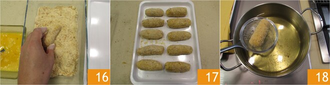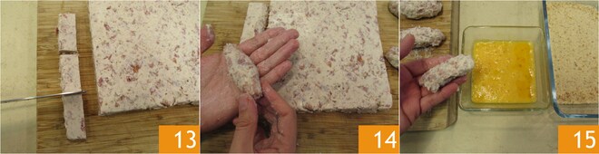Con un cuchillo, corta 10 rectángulos iguales 13. Dales forma de croqueta moldeándolos con las manos húmedas. Pasa las croquetas primero por los huevos batidos 15