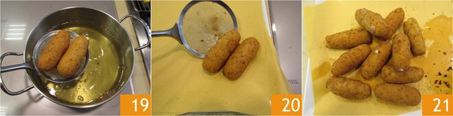 Escúrrelas cuando estén doradas 19 y déjalas secar sobre papel absorbente 20. Sirve enseguida las croquetas de jamón 21.