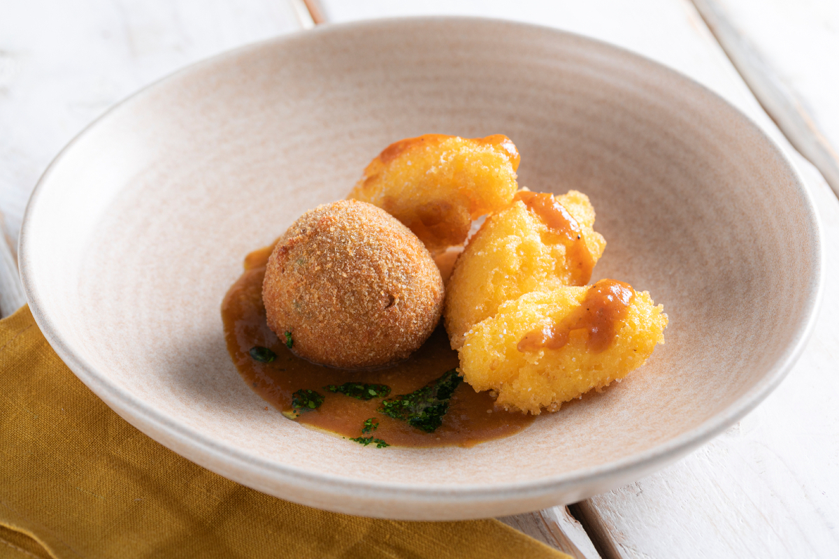 La carne tierna y suculenta del osobuco de ternera se funde con el sabor rico y mantecoso del tuétano y con el aroma del típico gremolada, tomando la forma de crujientes albóndigas de color dorado. De acompañamiento no la polenta habitual, sino unas crujientes quenelles de Polenta frita para un segundo plato tentador y apetitoso. ¡Lleve a la mesa la tradición con una nueva apariencia con nuestras irresistibles croquetas de osobuco, perfectas para enriquecer un Cuoppo alla milanesa!