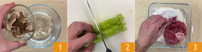 Para preparar las croquetas de osobuco, lo primero que debe hacer es rehidratar los hongos secos en agua tibia durante unos 15 minutos 1. Mientras tanto, limpie y corte el apio 1, la zanahoria y la cebolla en trozos grandes. Ahora enharine los osobucos por ambos lados 3.