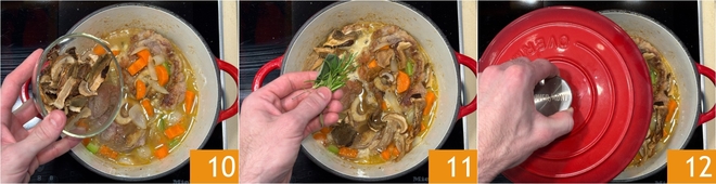 Añada también los hongos secos escurridos 10, la salvia y unas agujas de romero 11. Tape con la tapa 12 y cocine en horno estático precalentado a 170° durante aproximadamente 80 minutos (si ha usado una cazuela no apta para cocinar en el horno, puede transferir todo a una bandeja antes de agregar el caldo, los hongos y las hierbas aromáticas).
