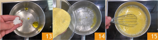 Mientras tanto, puede ocuparse de la polenta: en una olla vierta el agua, el aceite y la sal 13. Lleve a ebullición, luego agregue la harina de maíz en forma de lluvia 14 y mezcle bien con un batidor 15.