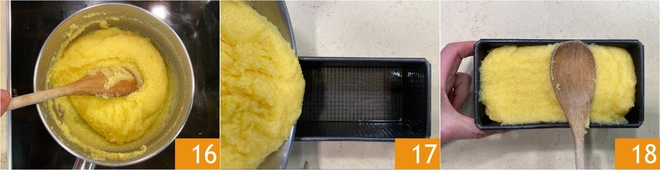 Cocine a fuego bajo durante aproximadamente 45 minutos, revolviendo de vez en cuando, hasta que se espese 16. Una vez lista, transfiera la polenta a un molde 17 y nivele la superficie 18. Cubra con film y deje enfriar completamente a temperatura ambiente.
