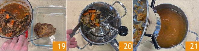 Transcurrido el tiempo de cocción de la carne, retire los osobucos de la cazuela y póngalos a un lado 19. Pase el fondo de cocción con las verduras por un pasapurés 20 para obtener una salsa 21.
