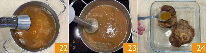 Ajuste la salsa de sal y pimienta 22 y vuelva a ponerla al fuego para calentarla. Puede licuarla aún más con una batidora de inmersión para obtener una consistencia más suave y homogénea 23. Cubra los osobucos con la salsa caliente 24.