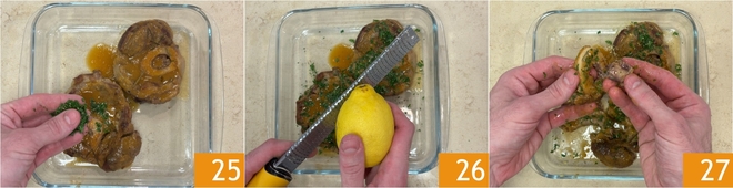 Aromatice con el perejil y el romero finamente picados 25 y ralle la cáscara de limón 26, luego deje enfriar completamente. Una vez fríos, retire el tuétano 27.
