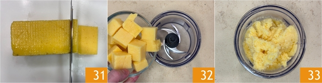 Reserve las albóndigas y recupere la polenta, ya fría. Corte la polenta en cubos grandes 31, luego colóquelos en una batidora 32 y mezcle para obtener una mezcla suave 33.